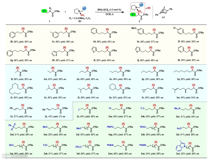 图2. 过渡金属催化的烷基卡宾B-H键插入反应底物适用性考察