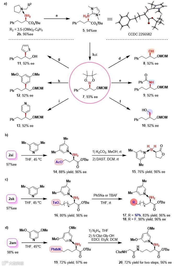 (图3b, 3c, 3d)。烷基链上的官能团转化体现了该类手性硼烷化合物在后期修饰方面的潜力。