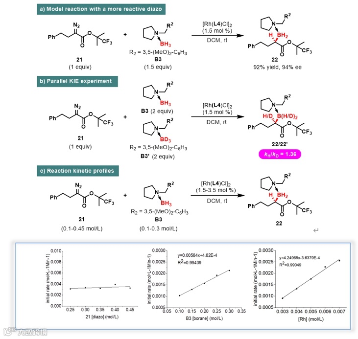 进行测量,得到平行同位素动力学效应为1.36。同时,该反应动力学中重氮为零级反应,硼烷和催化剂为一级反应,动力学实验结果表明C-B键的形成过程可能是反应的决速步骤(图4)。