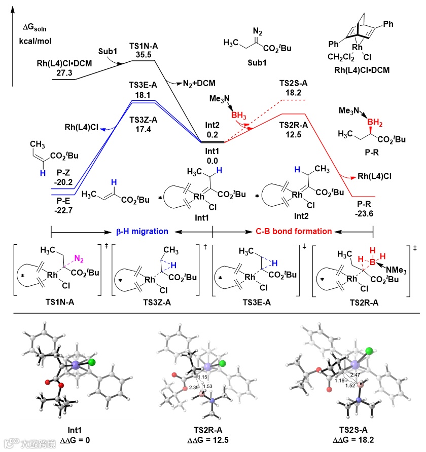 构型产物的B-H键插入反应过渡态的能垒,该结果与动力学研究数据一致。即在一价铑/双烯体系中,相较于