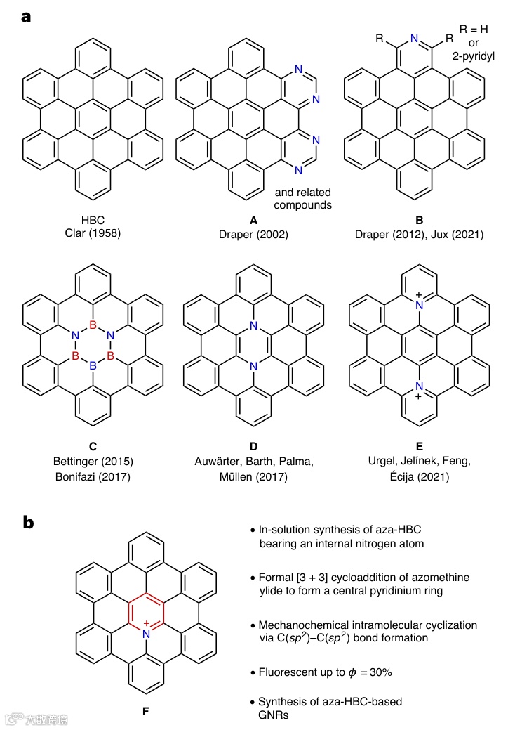 )及其阳离子类似物。虽然这些HBC分子的外围具有氮原子,但如何将杂原子掺入内部框架仍极具挑战性,彼时内含杂原子的HBC分子主要是通过表面合成方法获得,例如:2015年嵌入环硼氮烷的HBC(