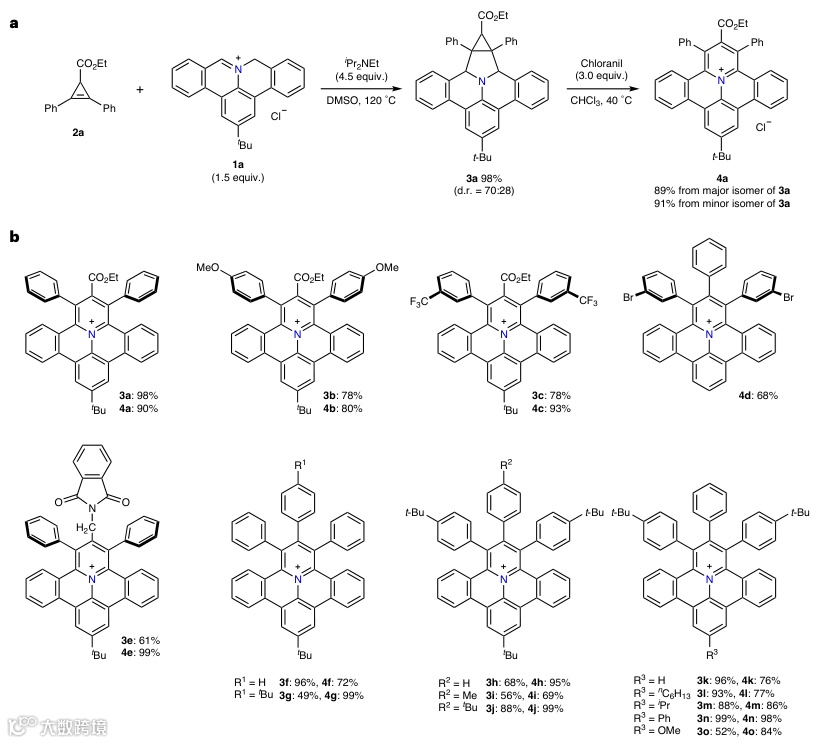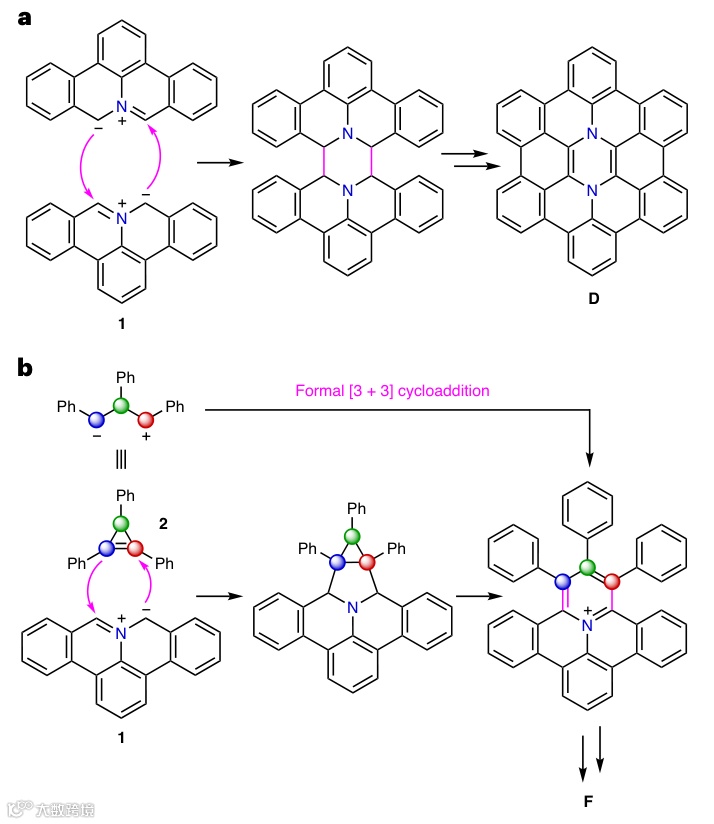 (图2b)。该反应的关键在于一步[3+3]环加成反应开创性地引入了外周6个苯环,构建的中心吡啶环也为6个原子,吡啶环和外周苯环又通过6个六元环融合,这波操作666!此外,作者还通过各种光谱方法研究了氮杂六苯并蔻盐