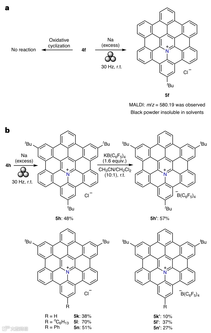 进行Scholl反应,但都以失败告终,这可能是由于吡啶鎓前体的缺电子性质阻碍了氧化反应(图4a,左)。为此,作者在还原条件下进行环化(图4a,右),即在过量Na存在下于室温对