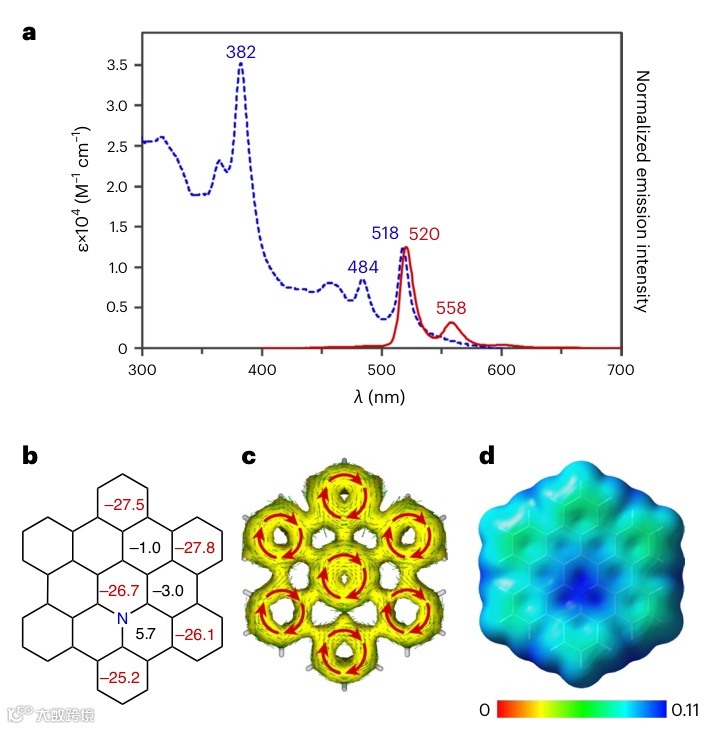 本文研究团队报道了一种阳离子氮嵌入六苯并蔻衍生物(3
