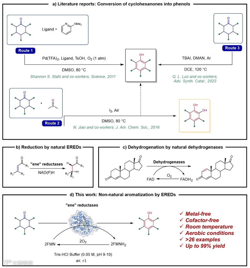 导读:南京工业大学郭凯/胡玉静团队基于绿色合成的理念,利用黄素依赖型烯还原酶的催化混杂性,在温和条件下实现了烯还原酶 (TsER) 催化取代环己酮的直接芳构化制备取代基苯酚