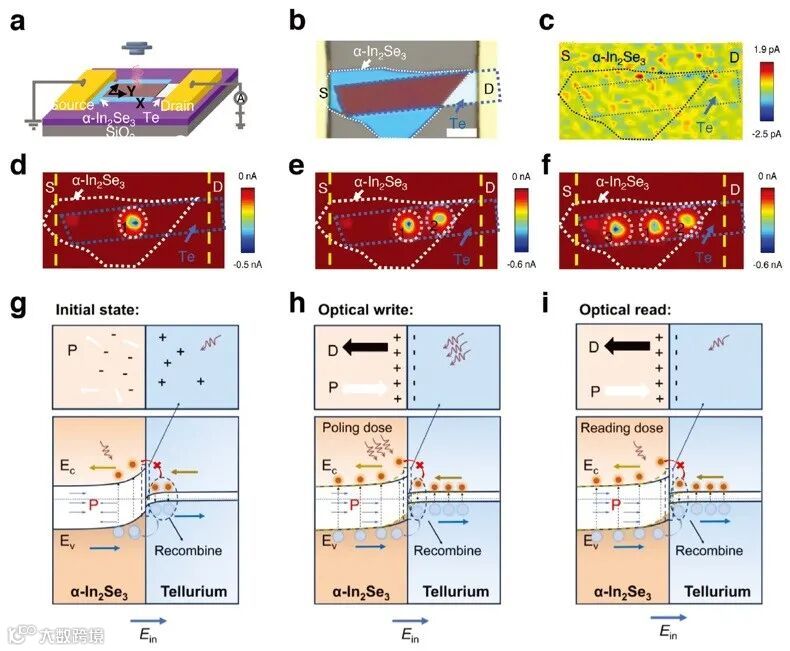 异质结的空间分辨扫描光电流图及能带结构。(a)器件的三维示意图,(b)异质结的光学图像。(c-f)在自供电模式下,异质结在极化前后的空间分辨扫描光电流图。(g-i)零偏置电压下的 "强光写入和弱光读取" 机制。