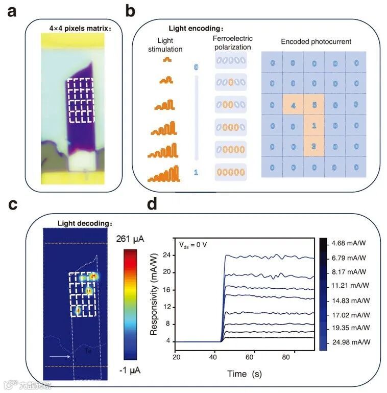 /Te 光电探测器阵列被设计成视觉传感器。该阵列可执行图像感应和记忆功能。(b) 光编码。(c) 光解码。(d) 探测器在不同时间零偏压光刺激(波长 520 nm,强度 11.3 μW c