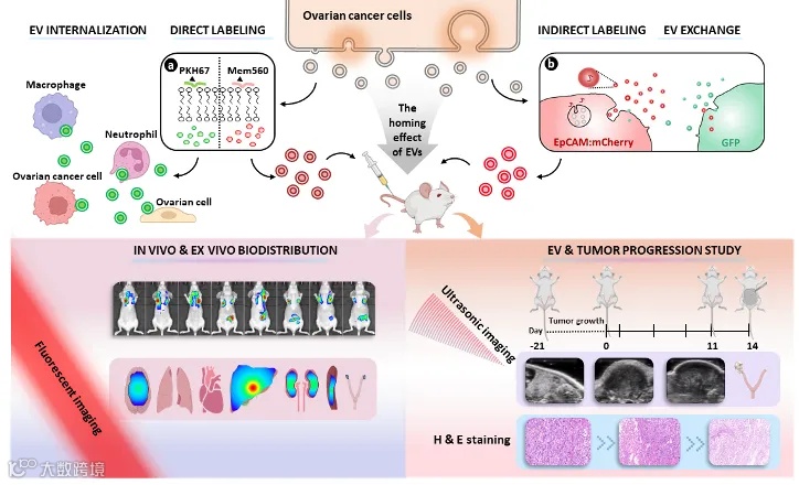 细胞外囊泡(EVs)在介导细胞间通讯中发挥着至关重要的作用,特别是在肿瘤生物学中,对于EVs功能的研究有助于深入理解其在癌症发展中的作用。在本项研究中,于法标教授课题组利用脂质小分子染料和荧光蛋白转染的膜探针对卵巢癌EVs进行荧光标记,并通过高分辨荧光成像和超声成像分别在活细胞和小鼠模型中进行了详细的可视化研究。细胞实验显示,两种膜探针均可以对EVs进行高效标记,并在单细胞和单个卵巢癌EVs水平上监测卵巢癌EVs侵袭卵巢细胞的行为,证实了肿瘤EVs的归巢靶向能力。进一步实验中,以正常和荷瘤小鼠为模型进行了体内超声和荧光成像。结果表明,注射卵巢癌EVs后,加速了小鼠体内肿瘤的生长,而且促进了原发性肿瘤的转移。这些发现为深入了解卵巢癌的发展提供可视化证据,也为开发基于细胞外囊泡的癌症诊断和治疗策略奠定了良好的基础(