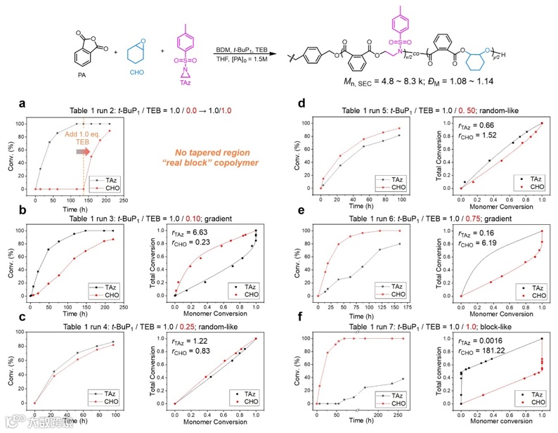 通过调节磷腈碱与三乙基硼烷催化剂的比例,他们能够从环氧化物、N-甲苯磺酰基氮杂环丙烷和环状酸酐单体组合中合成出多种结构的共聚物,包括ABA型嵌段共聚物、ABA梯度共聚物、无规共聚物、反向BAB梯度共聚物和反向BAB嵌段共聚物(如图1所示)。