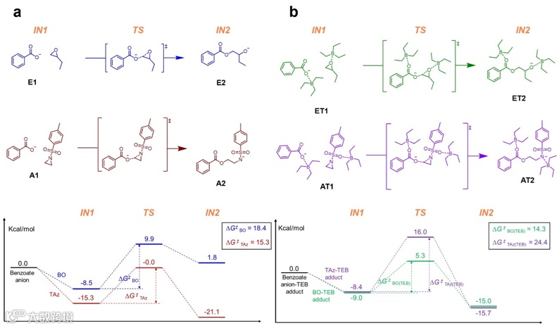 图3. 密度泛函理论计算的苯甲酸阴离子打开环氧丁烯和N-甲苯磺酰基氮杂环丙烷环的