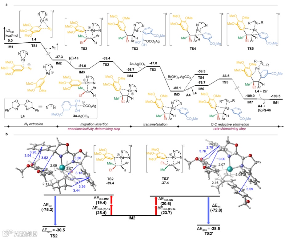 、三取代苯乙烯迁移插入到Pd–C键、银盐辅助芳基硼酸的转金属化等步骤,最终通过C–C还原消除和配体交换产生1,2-双芳基化产物并再生催化剂活性物种。理论计算表明C–C还原消除是反应的决速步,DTBF(富马酸二叔丁酯)先通过配体交换再进行还原消除可以降低反应能垒,这也与实验观察到的DTBF配体可以促进反应进行的现象一致。三取代苯乙烯的迁移插入是反应的对映选择性决定步。结构分析表明