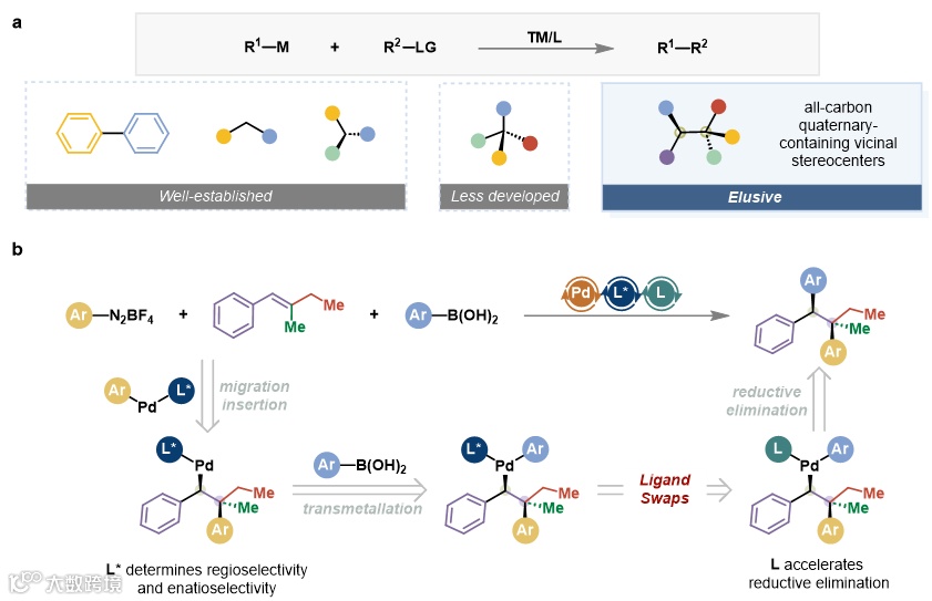 立体中心最为直接有效的策略之一,并被广泛用于天然产物和药物分子的合成中。然而,利用过渡金属催化的分子间的不对称偶联反应构建全碳季碳中心仍然存在巨大的挑战,主要包括:高度拥挤的立体环境使得C‒C 成键位阻较大;另外,当四元碳立体中心同时含有多个电性和位阻相近的取代基时,立体专一性地构建该季碳中心就更为困难。更重要的是,目前含全碳季碳的连续手性中心的不对称偶联反应鲜有报道 (图1a)。