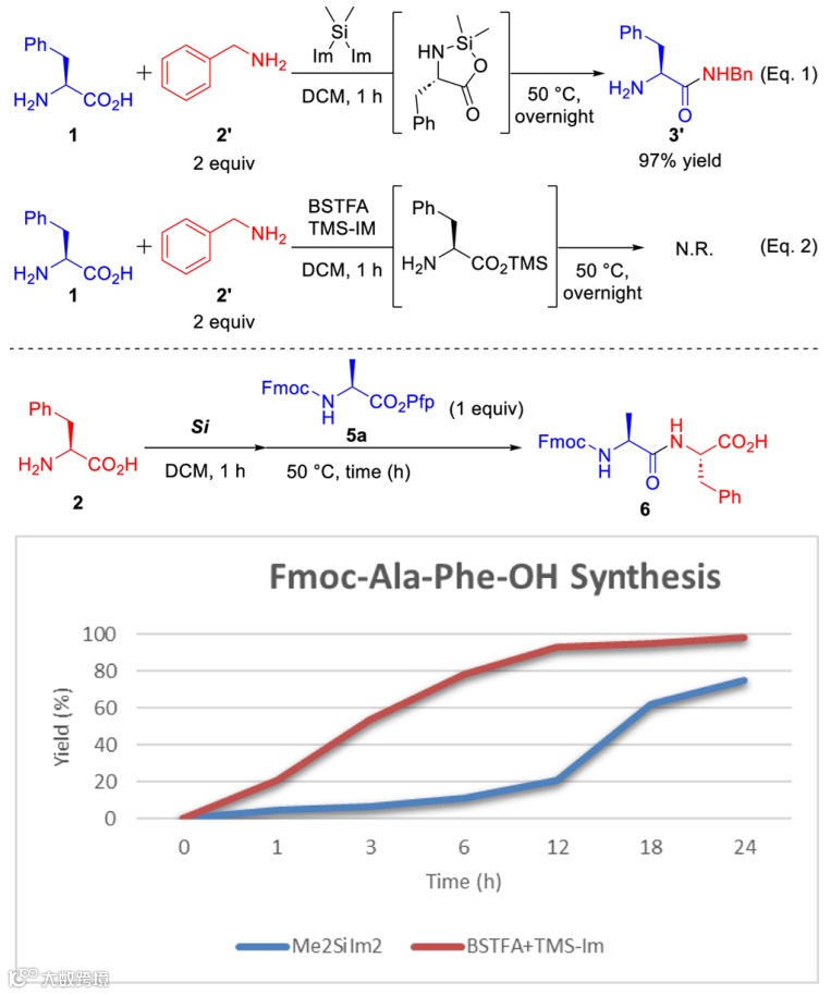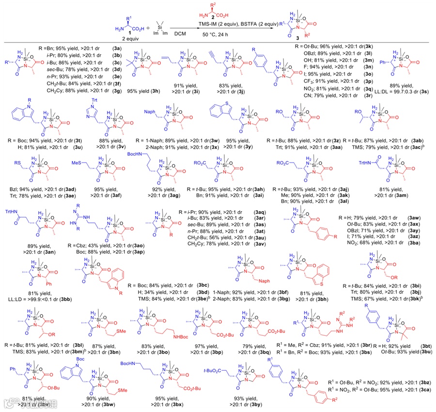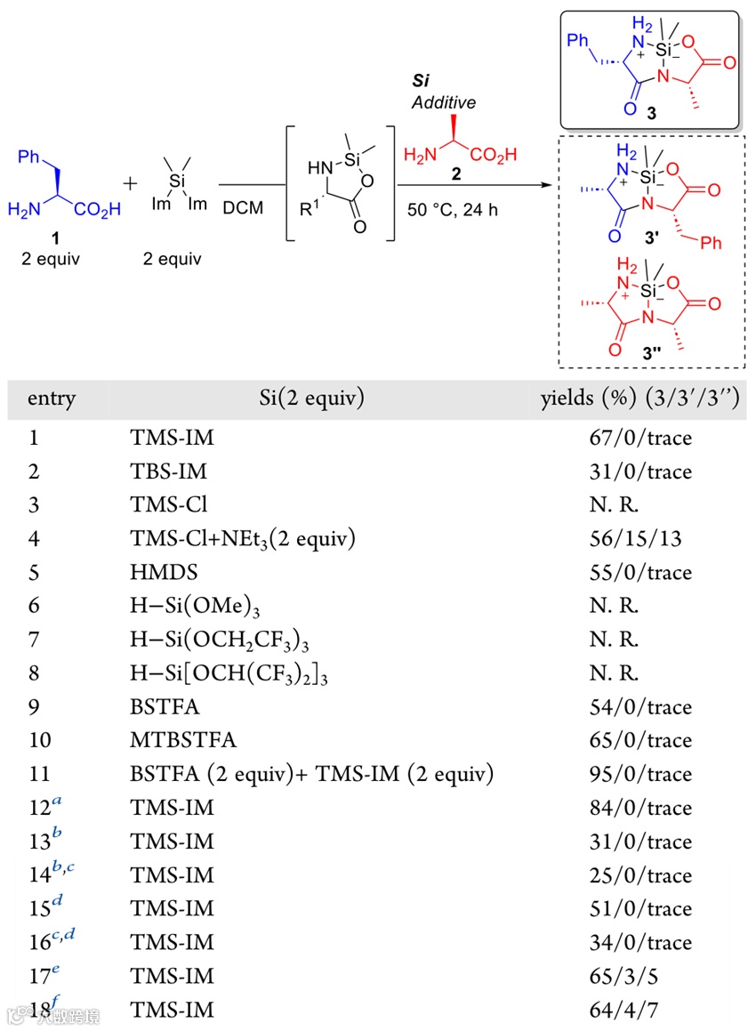 作者设想,带有两个离去基团的Si试剂与一个无保护氨基酸(N端氨基酸)反应时,会形成五元环中间体,此中间体可作为后续酰胺化反应中的亲电试剂。另一个无保护氨基酸(C端氨基酸),其羧基可与另一种Si试剂反应并生成相应氨基酸硅酯,这个硅酯则作为酰胺化反应中的亲核试剂。如此看来,找到合适的Si试剂是重中之重。作者使用苯丙氨酸(Phe,1)与双(1-咪唑基)二甲基硅烷在DCM中室温下反应1小时,然后加入各种Si试剂和丙氨酸(Ala,2)在50 °C下进一步剧烈搅拌24小时,然后通过硅胶柱色谱法分离产物(3),并比较了产物中硅环二肽的分离收率,以及反向序列(3′)和自缩合(3″)杂质形成(图2)。结果显示,尽管烷氧基硅烷在该反应中不适用(反应6-8),但有几种Si试剂起到了效果(反应1、2、4、5、9、10)。特别是N-三甲基硅基咪唑(TMS-IM)和N,O-双(三甲基硅基)三氟乙酰胺(BSTFA),都获得了优良的选择性和高产率。值得注意的是,当使用TMS-IM和BSTFA的混合物作为Si试剂时,反应几乎全部完成(反应11)。可见,使用这两种Si试剂的组合显著提高了氨基酸-TMS酯的形成效率。作者认为,BSTFA在无保护氨基酸的硅化反应中发挥了作用,而TMS-IM具有双重作用,能够与无保护氨基酸配位,增强其在DCM中的溶解度,并帮助氨基酸的硅化。一些反应在没有TMS-IM的情况下也可以进行(反应9和10),这可能是因为与Phe反应的双(1-咪唑基)二甲基硅烷将Ala转化为相应的硅酯。提高反应温度和加入金属催化剂似乎促进了硅化氨基酸的分解,导致产率和选择性降低(反应13 vs 14; 15 vs 16; 1 vs 17和18)。