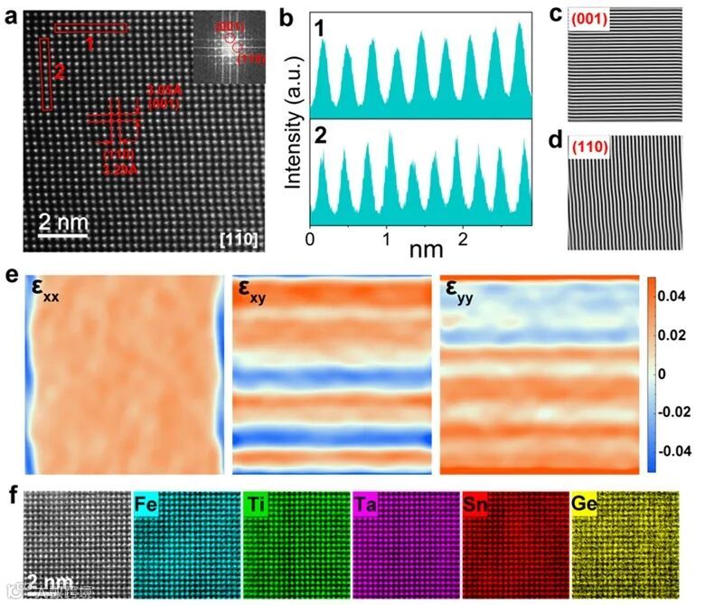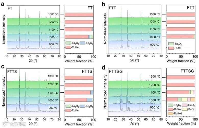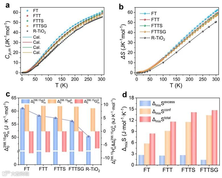 本工作系统地研究了多组分金红石氧化物的构型无序、尺寸失配、相变和局部多面体畸变之间的关系。通过精确测量热容,深入研究了电子熵、磁跃迁、晶格振动和组分无序对其热稳定性的影响。随着元素数量的增加,振动熵从7.35R(Fe0.5Ta0.5O2)逐渐减小至6.76R(Fe0.21Ti0.21Ta0.21Sn0.21Ge0.16O2)。对于包含最多元素的FTTSG,Ge4+在所有组分中具有最小的离子半径,可以产生软Ge-O键,从而决定了其热稳定性和单相的形成。尽管所有样品过量振动熵的大小小于相应的构型熵,但过量振动熵在金红石多组分氧化物的形成中起着重要作用,并且多组分氧化物中八面体畸变的增加导致热稳定性逐渐降低。这一发现进一步揭示晶格振动的作用及其与化学无序的关系有望为高熵氧化物的开发提供重要的热力学基础。