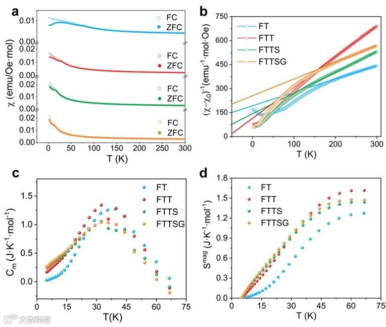 图6. 合成样品的磁性、磁热容和磁熵。(a)多组分氧化物FT、FTT、FTTS和FTTSG的零场冷(ZFC)、场冷(FC)磁化率和(b)逆磁化率与温度的关系。在5-66K范围内所有样品的(c)磁热容和(d)磁熵。 总结与展望