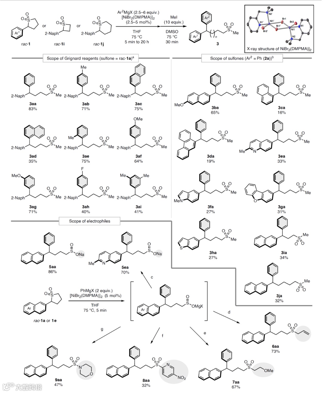 非常大(Mes)基团取代的格氏试剂也不参与反应。其次,作者考察了砜的底物范围(图3,右),结果显示甲氧基(