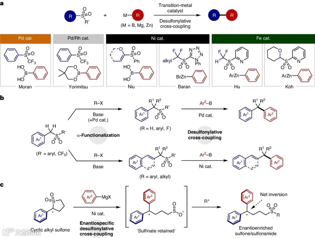 教授研究团队证明砜在金属催化的交叉偶联反应中既可以作为导向基团又可以作为亲电试剂,而且还能与芳基硼酸进行Pd催化的脱磺酰化偶联反应以及Ni催化叔砜的Suzuki-Miyaura交叉偶联反应(图1b)。在此基础上,近日,