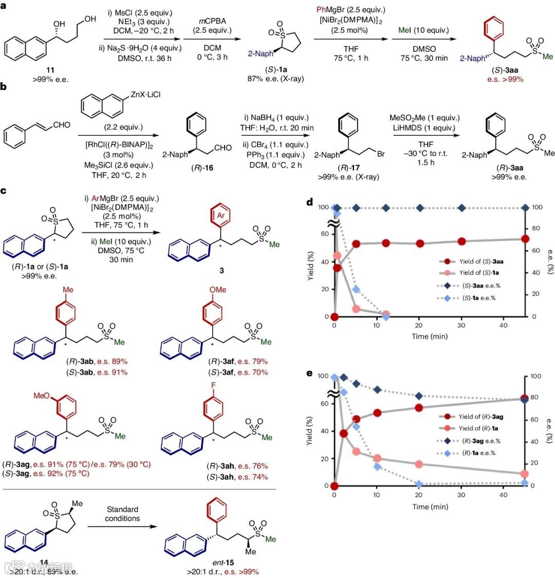 利用Ni催化的Kumada-Tamao-Corriu偶联策略,成功地实现了手性环烷基砜与格氏试剂的对映特异性交叉偶联反应