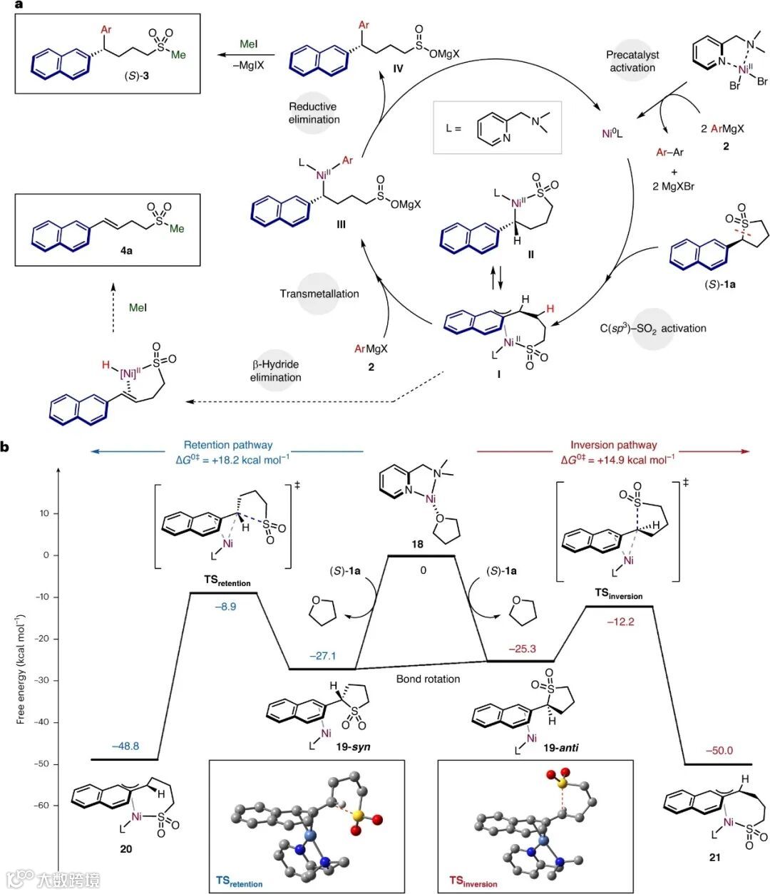 本文采用Ni 催化 Kumada-Tamao-Corriu 偶联策略,成功地实现了环烷基砜与格氏试剂的对映特异性交叉偶联反应,并且产物中可保留磺酰基,同时还在转化过程中实现高达99%的手性转移。原位监测表明交叉偶联与竞争性去质子化在动力学上竞争占优,进而带来高对映选择性转化。
