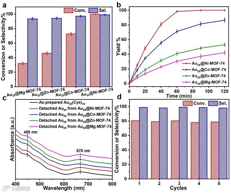 NCs在M-MOF-74中的封装显著提高了催化活性。并且,随着反应时间的增加,反应产率逐渐增加,