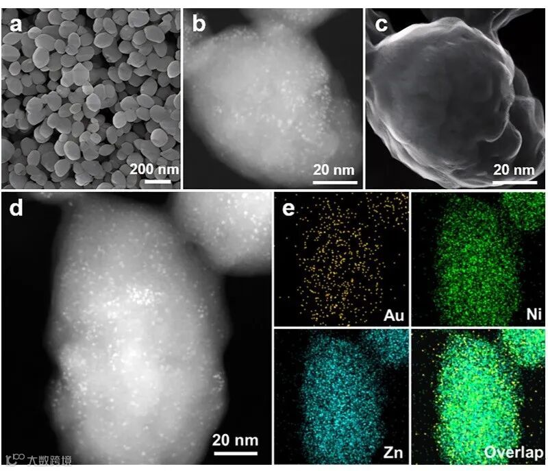 @Ni-MOF-74的HAADF-STEM图像,以及 (e) 对应的Au、Ni、Zn元素分布的能谱分析图及其重叠图。