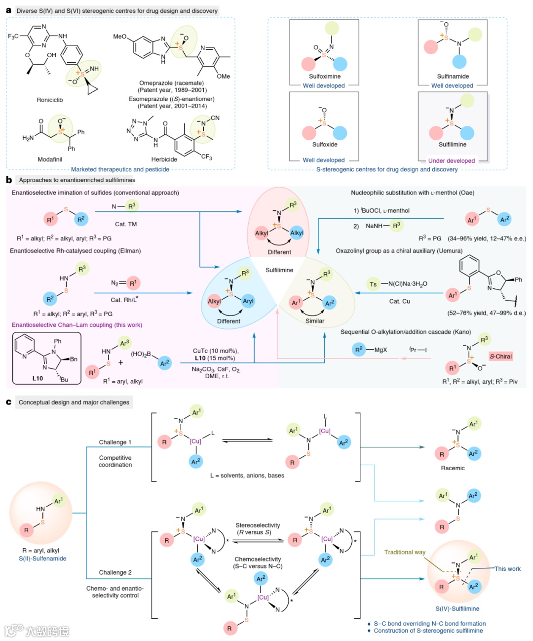 硫手性分子广泛存在于天然产物中,对药物开发也具有重要作用(图1a)。其中,硫亚胺是一类具有S(IV)-立体中心的手性分子,是亚砜的氮杂类似物,在化学和生物学上具有重要的应用价值。然而,由于手性硫亚胺的合成报道较少,限制了对其生物活性的探索。在传统的合成方法中,手性硫亚胺主要通过硫醚的对映选择性氧化来制备,其依赖于催化剂对硫原子上两个取代基团的差异性识别。因此,手性芳基烷基硫亚胺以及二烷基硫亚胺可以实现高对映选择性制备,而二芳基硫亚胺由于两个芳基的大小差异很小,对映选择性较差(图1b)。因此,发展一种具有广泛官能团兼容性和高对映选择性的硫手性芳基硫亚胺合成策略仍然是一个挑战。