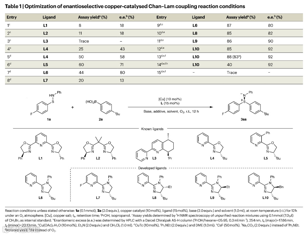 绝大多数的Chan-Lam偶联具有无需外加配体的简单催化体系,缺乏可供调控的手性因素,而溶剂、碱或者催化剂的阴离子均可以高效促进该反应的进行(图1c),产生难以克服的消旋背景反应,限制了Chan-Lam偶联在不对称催化领域的应用。基于前期积累,该课题组在本研究中提出了对映选择性的次磺酰胺Chan-Lam偶联