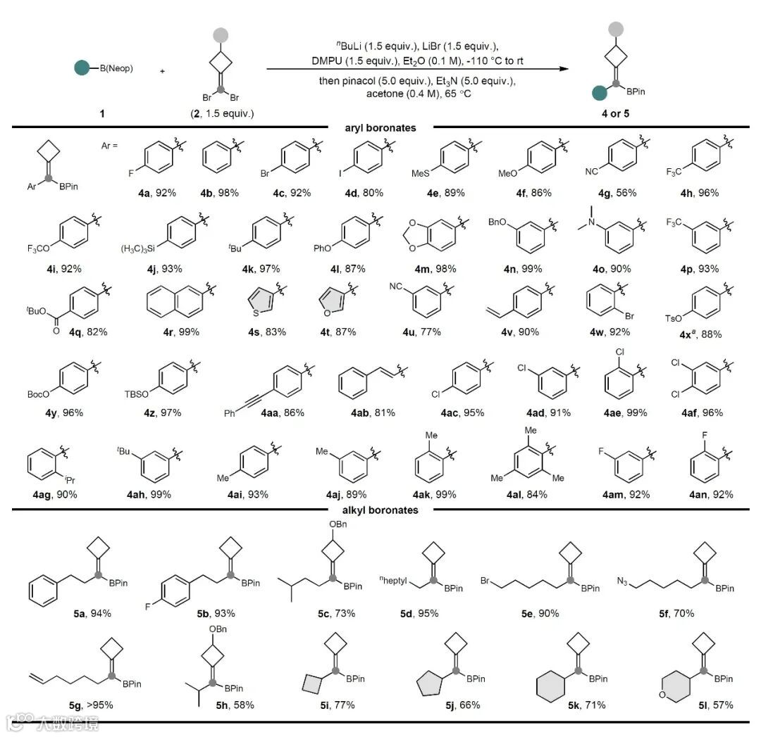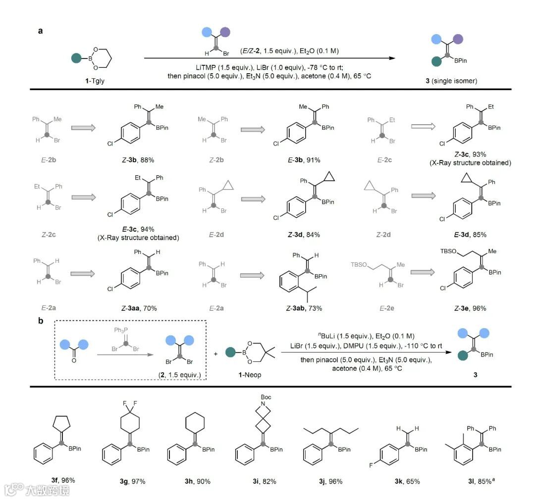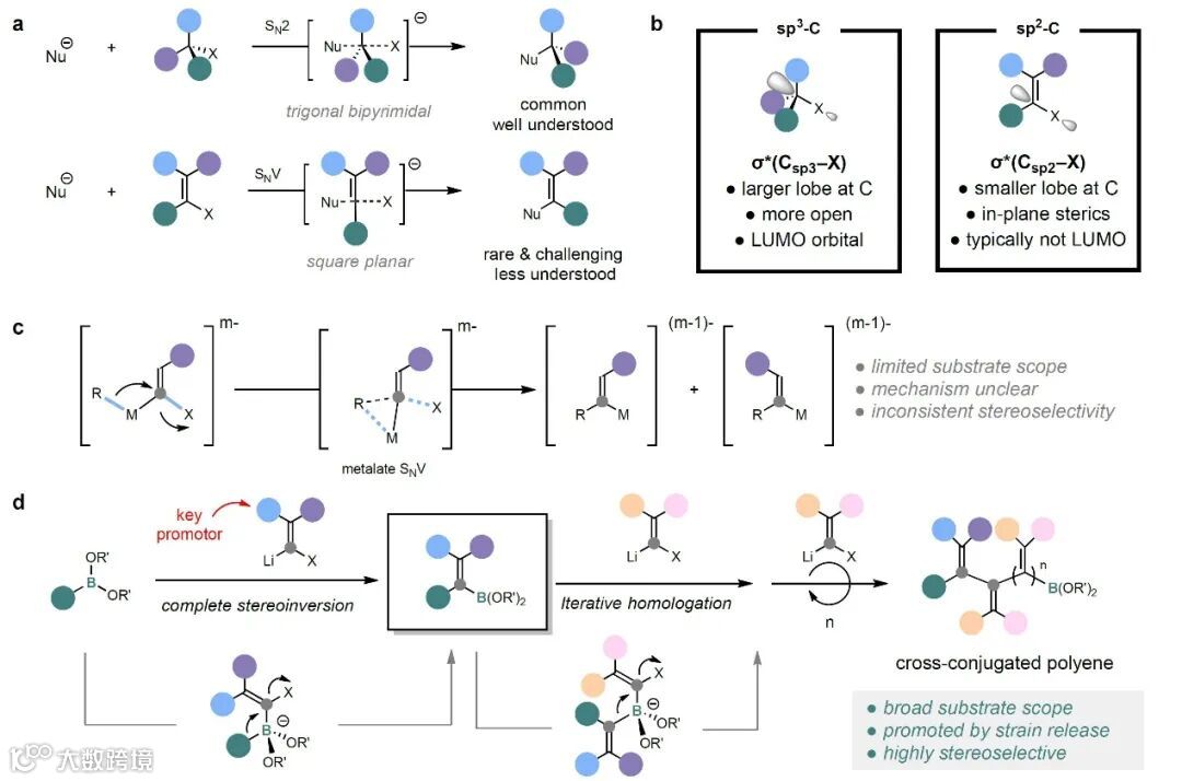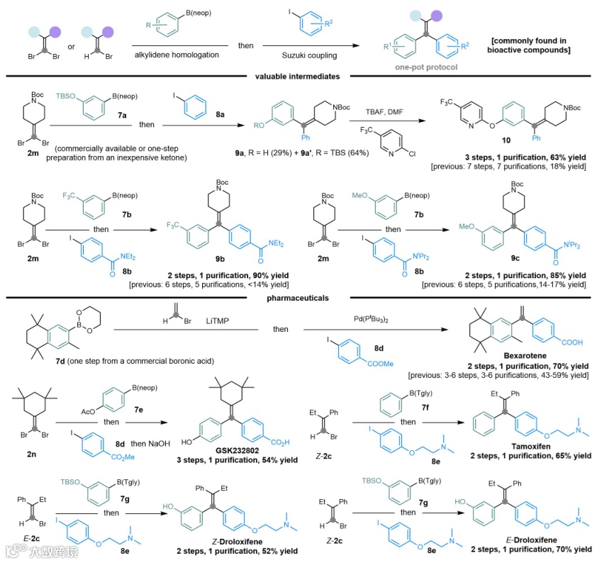董广彬教授与刘鹏教授等研究者利用金属化配合物介导的协同SNV反应,成功地实现了有机硼酸酯的立体特异性亚乙烯基同系化反应,并且能够迭代多个亚烯基单元,从而获得先前难以制备的交叉共轭多烯。此外,作者还利用该方法立体特异性地制备了多种生物活性分子和药物分子,极大地简化了先前的合成路线,同时计算研究表明在平面正方形过渡态中空间张力的减少促进了不寻常的类SN2协同途径,从而为其它同系化反应的发展提供了新思路。