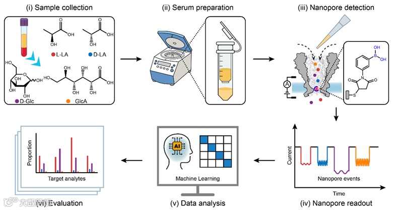 整个分析过程简便快捷,不需要复杂的样品分离。将血清样本超滤处理后加入到测量装置中,即可产生连续的纳米孔事件。L-/D-乳酸、D-葡萄糖和葡萄糖酸中含有的顺式二醇部分,可以与MspA-90PBA的PBA接头形成可逆的硼酸酯,报告独特的纳米孔事件特征用于鉴定。结合定制的机器学习算法,可以精准和自动化识别血清中不同的目标分析物(图1)。这些结果证明了纳米孔传感器在医学诊断中的潜在应用,并可能为即时检测(POCT)设备的发展提供新思路。