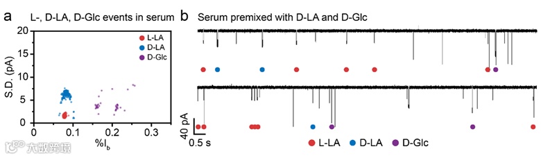 为了展示该技术同时鉴定L-/D-乳酸和D-葡萄糖的分辨率,作者进一步在标准人血清中添加了D-乳酸和D-葡萄糖。这种特殊制备的人血清样品与上述样品保持相同的预处理和测量方法。通过定制的机器学习算法,可以清楚地看到该样品中L-/D-乳酸和D-葡萄糖的纳米孔事件。上述所有化合物都具有高度可区分的事件特征,因此可以在同一系统中进行同时分析(图3)。L-/D-乳酸的纳米孔鉴定不需要样品分离,相较于传统分析方法更加简单。