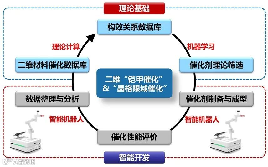 针对二维“铠甲催化”与“晶格限域催化”概念的发展和完善,该团队结合密度泛函理论计算、大数据机器学习与智能机器人自动化实验,研究二维表界面原子与电子结构调控机制,探索惰性小分子催化转化新过程和机理,揭示二维“铠甲催化”和“晶格限域催化”的物理化学本质,设计新型高效催化剂并进行高通量智能自动化筛选(图6)。