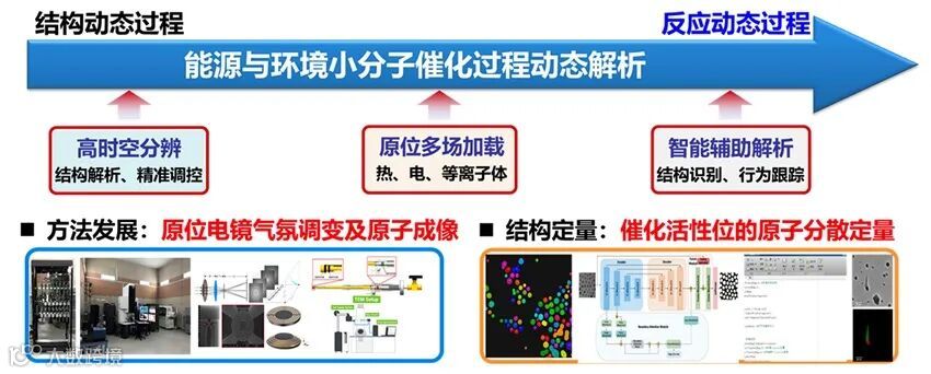 图4. 能源与环境小分子催化过程的动态解析。通过耦合原位显微(左)与结构定量方法(右),揭示催化反应活性的活性原子结构与反应机制。