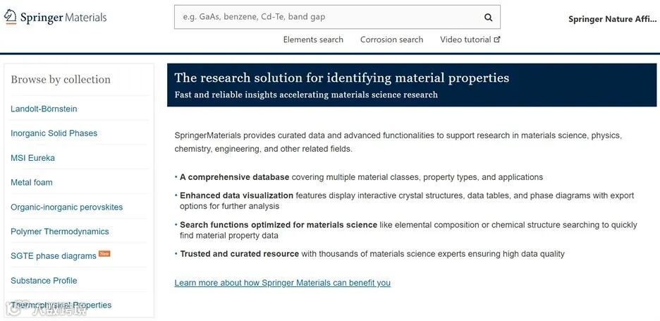SpringerMaterial数据库以该丛书为基础,进一步囊括了众多材料领域的数据信息。现已收录290,000余种材料及3,000余种性质,包含无机、有机物,金属与合金,陶瓷与玻璃等传统与新型材料体系,以及物理、化学、热力学等性质。