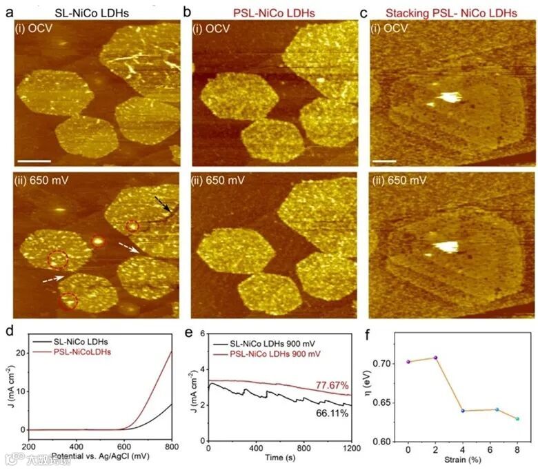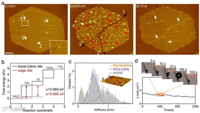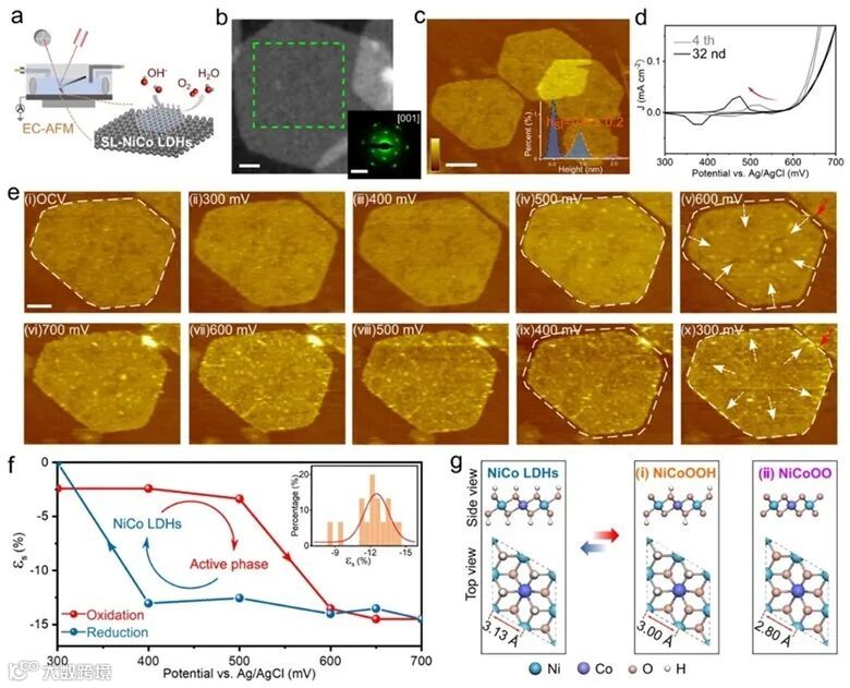 以单层层状双氢氧化物(LDHs)纳米片为研究模型,采用电化学原子力显微镜(EC-AFM)原位可视化了其在OER反应过程中的动态变化。