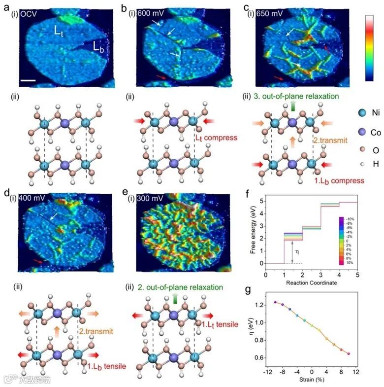 图4.(a-e)堆叠纳米片在不同电位的 (i) EC-AFM 图及 (ii) 起皱过程示意图。(f) 不同应变程度NiCo LDHs的OER的吉布斯自由能图。(g) OER过电位与应变程度的关系。