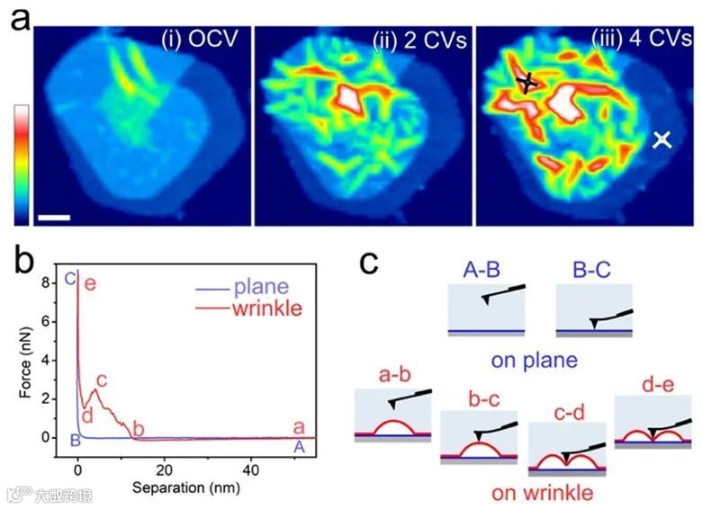 图3.(a)堆叠纳米片的EC-AFM图。(b)在纳米片平面和皱纹处获得的力-分离曲线。(c)针尖接近平面和皱纹时的响应状态示意图。