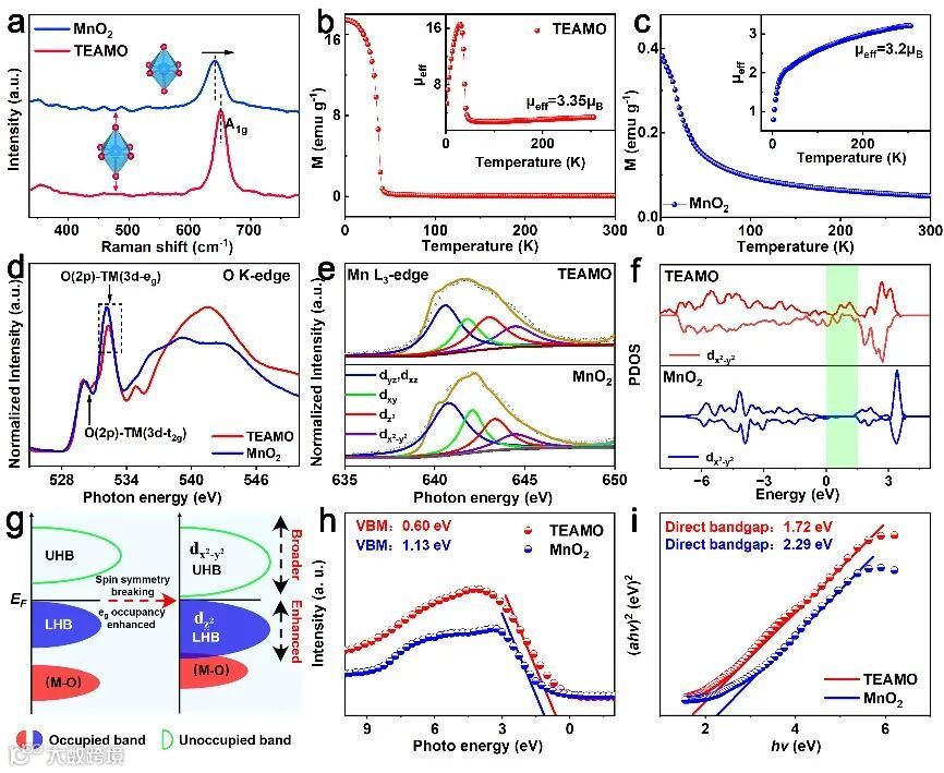 通过M-T测试、XAS光谱、PDOS、UPS光谱等实验表征手段及理论计算,作者成功证明了TEAMO中的自旋对称性破缺有效增强了Mn