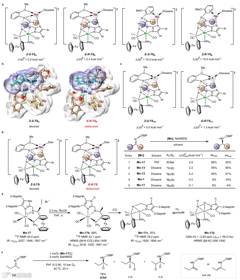 亚胺异构体之间的快速平衡使得仅有一种异构体能够按照有利的反应途径参与氢化反应。如图3a所示,作者研究了阴离子Mn-H络合物与底物的四种配位模式,结果显示与稳定的螯合配位(即钠离子与底物的N、O原子配位)相比,涉及阳离子-π相互作用的过渡态由于弱配位导致能垒较高。此外,过渡态