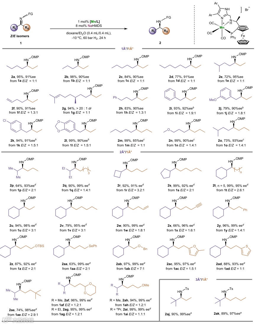 能够在二烷基酮亚胺的不对称氢化反应中精准识别微小差异的烷基取代基(如:甲基和乙基、乙基和正丙基),从而以优异的对映选择性获得一系列手性胺产物