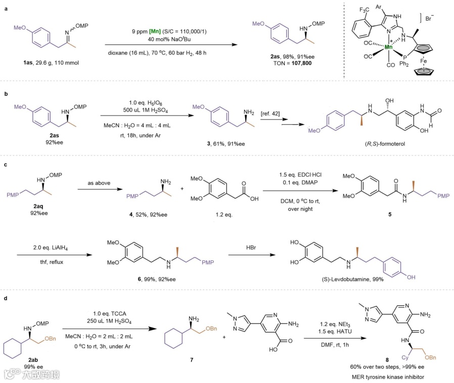 的不对称氢化反应能在低催化剂负载量(9 ppm)下以克级规模进行(29.6 g,110 mmol,S/C = 110000:1),并且催化剂周转数(TON)高达107800,这是迄今为止地球储量丰富金属催化剂不对称氢化的最高纪录。最后,作者进行了合成应用研究,具体而言:1)
