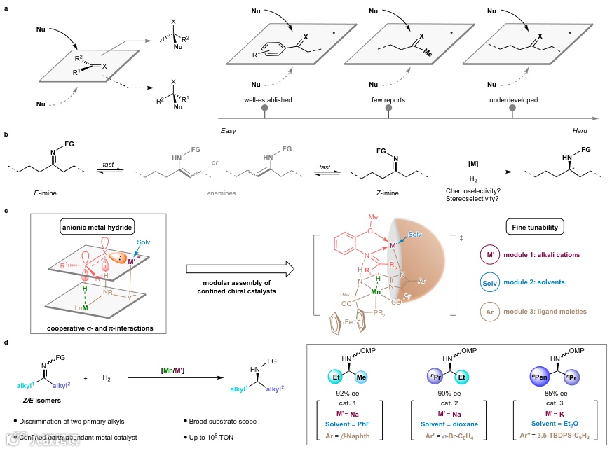 在过去的几十年里,不对称催化领域取得了巨大进展,其中的标志性事件就是Benjamin List和David MacMillan两位化学家因在不对称有机催化领域的贡献而荣获2021年诺贝尔化学奖。一般来说,不对称催化的核心目标是创造一种能够区分底物的前手性面或前手性中心的立体选择性催化剂,特别是不对称催化不饱和双键的亲核加成反应(图1a)。虽然目前大多数工作都集中在含有芳基和烷基的底物上,但当取代基具有非常相似的空间和电性(如:伯烷基和甲基)时却难以实现高对映选择性。另一方面,手性胺是生物活性分子、天然产物、农用化学品的重要结构单元,迄今为止化学家发展了多种方法来构建手性胺,其中最具代表性的是亚胺的不对称氢化反应。然而,二烷基酮亚胺的不对称氢化反应仍极具挑战性,这是因为