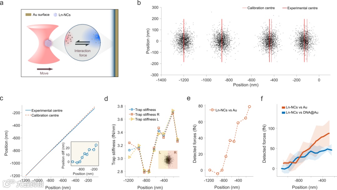 图4. a, 测量相互作用力的原理图。b, 被捕获的单个纳米粒子在不同位置的散点图。c, 对照组中心与实验中心位置的差值。d, 不同位置的捕获刚度。e, 不同位置的检测力。f,Ln-NCs 与金表面之间的平均检测力,以及 Ln-NCs 与涂有 DNA 的金表面之间的检测力。