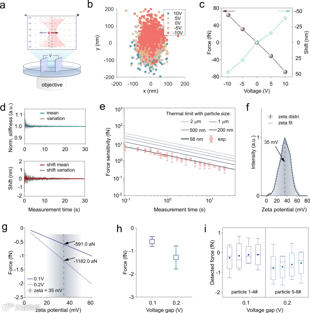 研究人员利用这种高精度定位方法研究了电场中上转换纳米粒子的弱电场力检测。在上转换纳米粒子直径为58纳米,表面电势约为35 mV的时候,分别用0.1 V与0.2 V的电压推动纳米粒子,在此电场力作用下,纳米粒子所受电场力分别为591 aN与1182 aN最小检测到的电场力为108.2 aN(图3i)。这是水溶液中光子力显微镜首次突破飞牛级别的测力精度。