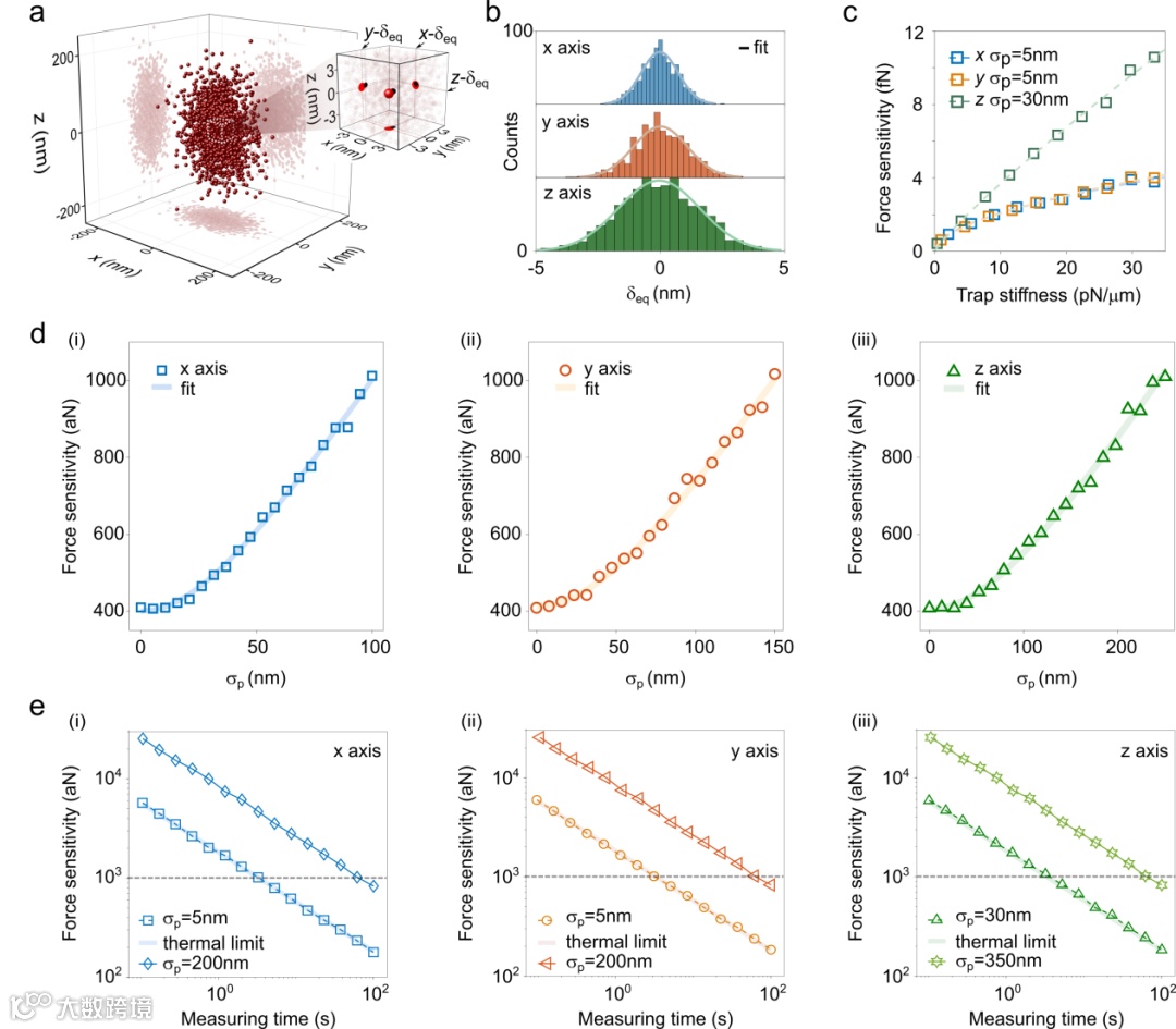 图1. a, 单个被捕获纳米粒子在无外力作用下的三维位置分布。b ,(a)中的测量统计直方图。c, 势阱刚度对力灵敏度的影响。d, 力灵敏度随 x 轴(i)、y 轴(ii)和 z 轴(iii)的定位精度而变化。e, 在小定位精度和大定位精度下,x 轴 (i)、y 轴 (ii) 和 z 轴 (iii) 的力灵敏度随测量数据量的变化。