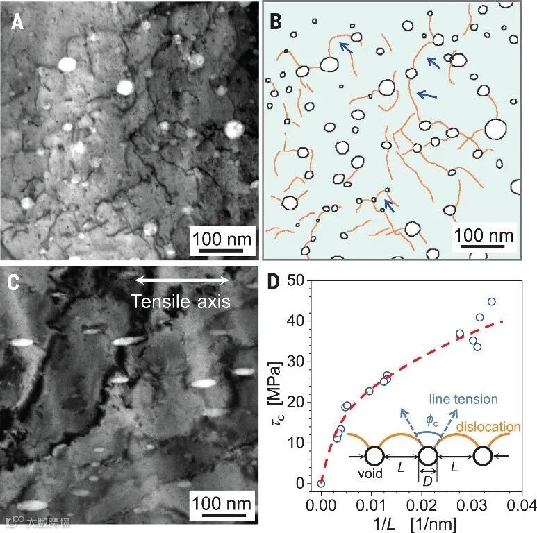 上是有利的,因为孔洞内的线张力为零。TEM图像也显示,纳米孔洞周围通常会出现多个位错,并且发生弯曲。尽管孔洞表面与位错的相互作用相对复杂,但这确实能够阻碍位错运动,从而提高机械性能。
