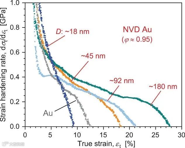 随着平均孔洞尺寸的减小,这些纳米孔金样品的拉伸应力-应变性能显著增强,其中孔径约为18纳米的样品屈服强度约为176 MPa,是纯黄金(85 MPa)的两倍多。不仅如此,纳米孔金还表现出比纯黄金更高的延展性和韧性。不过,这种机械性能的提升仅发生在孔洞尺寸小于临界值的样品中,该临界尺寸介于几百纳米到几微米之间,也说明孔洞尺寸对机械性能起着决定性的改变。