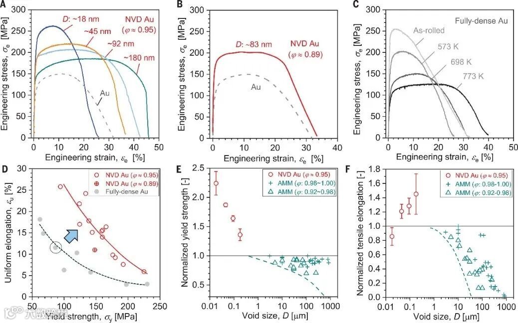 提出孔洞的存在并不总是对金属材料有害,相反,如果在黄金中“适当”地添加纳米级孔洞——尺寸细化至百纳米以下且均匀分散于材料中,可以增强材料的拉伸强度,同时提高其延展性。