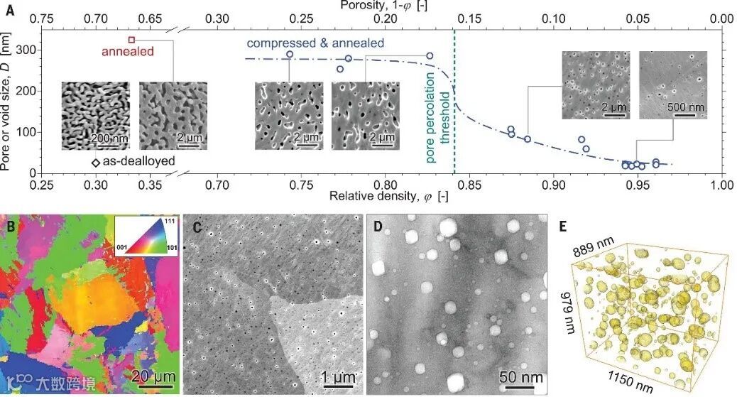 合金中的银元素,随后经过压缩和热退火处理,制备出具有均匀纳米孔结构的纯金样品。当压缩和退火处理后,样品相对密度低于临界值(φ = 0.82~0.84)时,孔隙结构相互连通;而当φ超过这一临界值时,通道由于Plateau-Rayleigh不稳定性而缩窄,转变为独立的纳米孔。电子显微镜图像显示,大多数纳米孔呈球形,直径从几纳米到50纳米不等,平均尺寸(D)为18 nm。此外,样品中的位错非常少,平均晶粒尺寸约为10微米,比纳米孔大三个数量级。