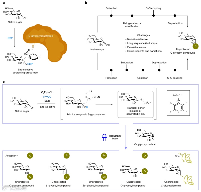 糖类化合物是生命细胞结构的主要成分以及供能物质,不仅可以为各种生命活动提供所需要的能量,还可以参与代谢及免疫功能的调节,以及维持肠道微生物群。然而,从自然界中分离提取纯的糖类化合物并非易事,科学家经常通过化学合成手段来合成糖类化合物以深入研究其功能。具体而言,未保护天然糖(自然界中最丰富的有机化合物)经羟基保护、官能团化和脱保护等多步合成序列来获得所需的无保护C-糖苷化合物(图1b)。但是,目前发展的化学糖苷化反应通常需要繁琐的保护基策略来克服位点选择性问题,同时存在反应条件苛刻、原子经济性差等缺点,影响其广泛应用。相比之下,酶促C-糖苷化反应能够在温和的条件下进行,并且具有高立体选择性和区域选择性(图1a),同时避免化学合成中繁琐的保护-去保护操作。