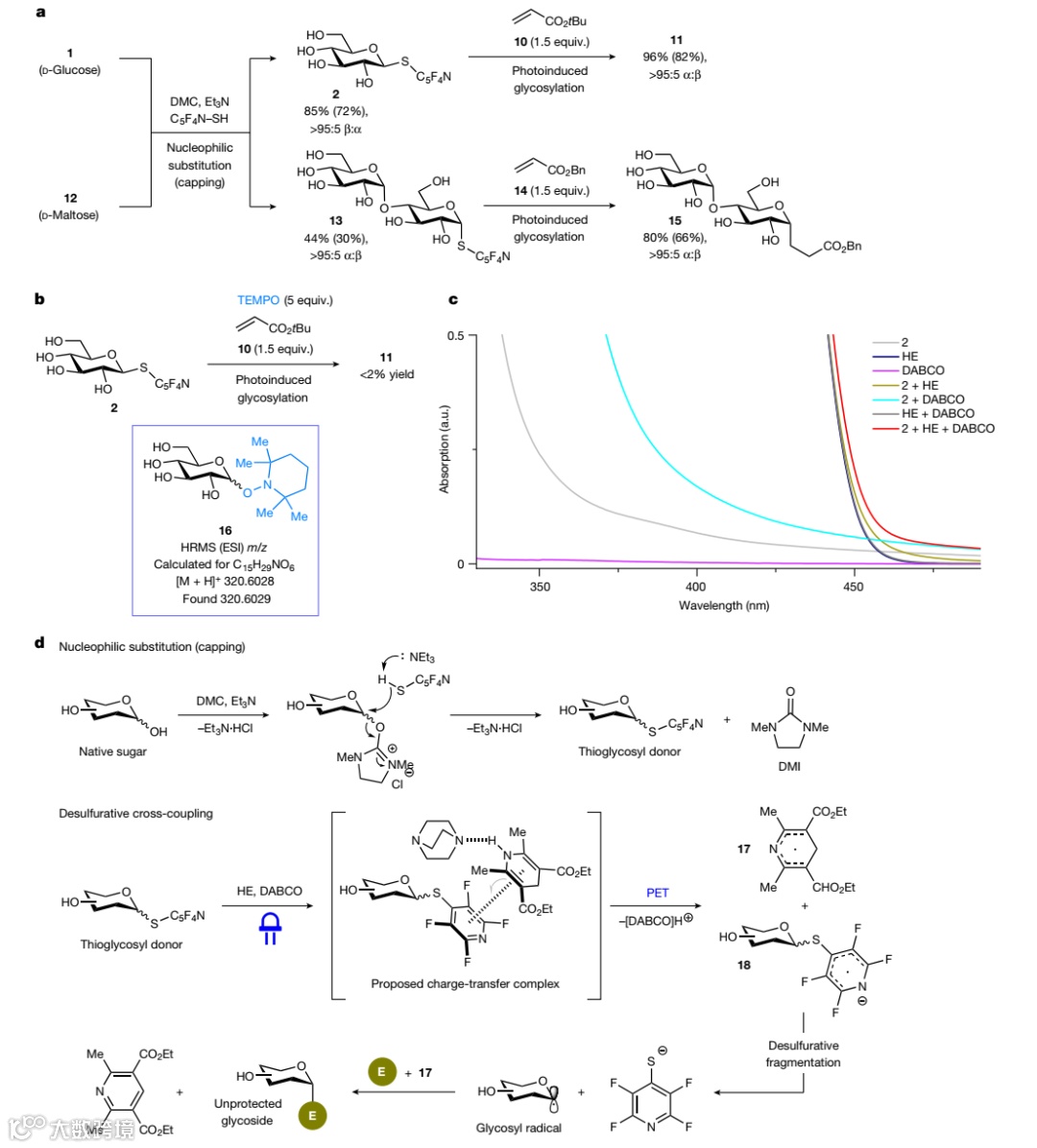 导读:新加坡国立大学的许民瑜教授课题组发展了一种仿生“封端-糖基化(cap and glycosylate)”策略,成功地实现了天然糖类化合物位点选择性和立体选择性的糖苷化转化(图1c),全过程无需金属催化